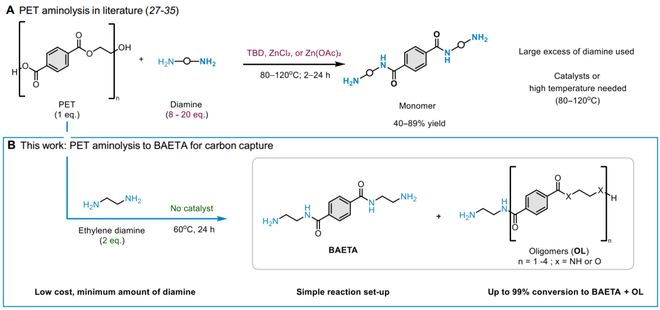 研究人员通过氨解反应将废弃PET塑料化学再利用,成功合成出一种新型的固态二氧化碳吸附材料——双氨基酰胺(BAETA)及其低聚物(OLs)。BAETA展现出优异的二氧化碳选择性、在高温下的热稳定性(250°C),以及良好的循环使用能力(多达150次循环)。该材料能够在烟道气(5-20% CO₂)和空气(400 ppm CO₂)中高效捕集二氧化碳,即便在潮湿条件下也不影响其吸附能力。本研究验证了从未经处理的消费级废PET(1千克)中大规模制备该材料的可行性,为塑料污染与碳排放问题提供了潜在的双重解决方案。