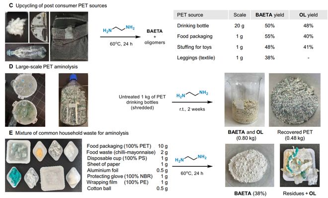 此外,在混合家庭垃圾中(包含食品残渣、纸张、塑料薄膜、橡胶手套等)依然能选择性分解PET并得到38%的BAETA产率,显示了该工艺在复杂废物流中的鲁棒性。