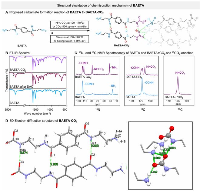 图4. BAETA在CO2吸收过程中的结构变化。(A)BAETA在CO2捕获条件下的氨基甲酸酯形成反应。(B)BAETA的FTIR光谱:DAC后(勃艮第),在150°C下热CO2捕获后(紫色),和贫BAETA(蓝色)。(C)固态15 N和13 C(仅羰基区域)使用1H 15 N CP(左)、1H 13 C CP(中)和具有13 C标记的CO2的1H 13 C CP(右)的BAETA(蓝色)和BAETA-CO2(品红色)的CP/MAS NMR谱;补充材料第4.3节中的全光谱。(D)通过ED获得的BAETA-CO2的结构。氮原子和氧原子之间的绿色线表示氢键(N-H···O)的距离,测量值在2.7和2.9Å之间。