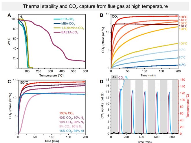 材料性能优异:BAETA展现出极高的热稳定性、耐氧化性和反复使用能力,显著优于传统液体胺和部分商业固体吸附剂。