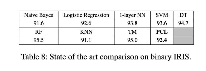 此外,我们将 PCL 的性能与标准 Tsetlin 机(TM)以及其他几种成熟的机器学习算法在二分类 IRIS 上的表现进行了比较,结果详见表8。值得注意的是,PCL 仅使用10个子句和100个训练轮次就取得了具有竞争力的结果。需要说明的是,PCL 报告的准确率是10,000次运行的平均值。其他方法均采用其默认实现参数,而 TM 使用了300个子句,并设置了特定参数(s = 2, T = 10),训练100个轮次。考虑到 PCL 分类器仅使用简单的 DNF 结构,这一结果是令人鼓舞的。