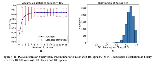 在本实验中,我们使用 PCL 作为分类工具,利用其析取范式(DNF)输出来展示其在真实世界问题——二分类 IRIS 上的表现。原始 IRIS 数据集包含150朵鸢尾花,分为三个物种。在二分类设置中,我们将其中一个类别 C 设为“真”,其余两个类别视为“假”(非C)。我们使用 sklearn 的二值化工具将4个原始特征转换为16个二进制特征。数据集按70%用于训练、30%用于测试进行划分。状态转移概率(即 pi 值)在区间 [0.6, 0.8] 内均匀随机选取。我们运行 PCL 10,000 次,每次训练100个轮次,并尝试不同数量的子句。图4(b) 显示了每个子句数量下的平均准确率及其标准差。值得注意的是,从6个子句开始,PCL 的准确率稳定收敛至92%以上,标准差约为0.04。此外,图4(a) 展示了使用10个子句时在10,000次运行中的准确率分布。显然,大多数运行的准确率超过80%(约5,000次运行的准确率超过94%),突显了我们方法行为的一致性和非随机性。在执行时间方面,单次运行耗时不到20毫秒,这得益于 PCL 简单的状态更新机制,体现了其高效性。